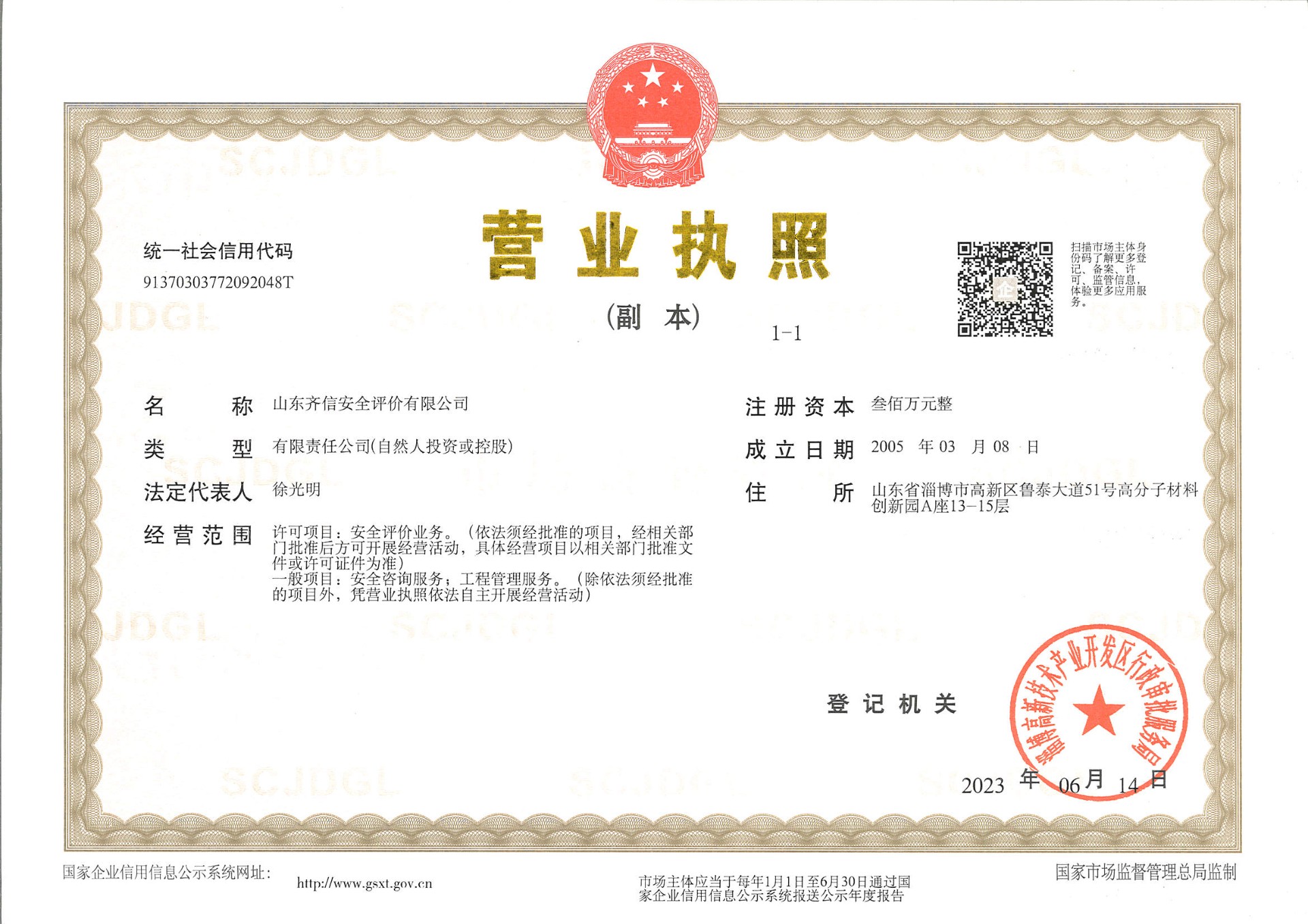 山東齊信安全評(píng)價(jià)有限公司成立于2005年3月,注冊(cè)資本300萬(wàn)元人民幣,固定資產(chǎn)總值804.8728萬(wàn)元。法定代表人徐光明,注冊(cè)地址及辦公地址位于淄博高新區(qū)魯泰大道51號(hào)高分子材料創(chuàng)新園A座13-15樓。2005年9月取得安全評(píng)價(jià)機(jī)構(gòu)乙級(jí)資質(zhì)。自國(guó)家應(yīng)急部1號(hào)令實(shí)施以來(lái),公司于2020年1月15日取得新安全評(píng)價(jià)資質(zhì),業(yè)務(wù)范圍包括:陸上油氣管道運(yùn)輸業(yè);石油加工業(yè),化學(xué)原料、化學(xué)品及醫(yī)藥制造業(yè);金屬冶煉。2018年12月21日取得安全生產(chǎn)標(biāo)準(zhǔn)化二級(jí)評(píng)審單位,評(píng)審范圍:危險(xiǎn)化學(xué)品、紡織、建材、輕工、冶金、機(jī)械。 公司現(xiàn)有人員41人,其中專(zhuān)職安全評(píng)價(jià)師37人,注冊(cè)安全工程師26人,研究員1人、碩士5人、雙學(xué)士1人,山東省安全專(zhuān)家?guī)鞂?zhuān)家1人、教授級(jí)高工1人,高級(jí)工程師8人、工程師22人,專(zhuān)職危險(xiǎn)化學(xué)品標(biāo)準(zhǔn)化評(píng)審員、工商貿(mào)標(biāo)準(zhǔn)化評(píng)審員30人,本科以上學(xué)